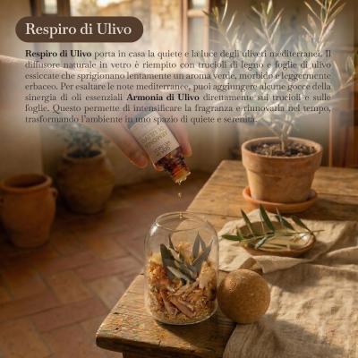 Per esaltare le note mediterranee, puoi aggiungere alcune gocce della sinergia di oli essenziali Armonia di Ulivo direttamente sui trucioli e sulle foglie. Questo permette di intensificare la fragranza e rinnovarla nel tempo, trasformando l’ambiente in uno spazio di quiete e serenità.